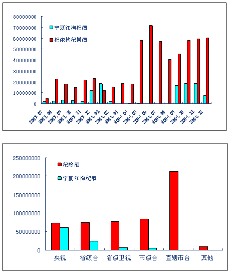 通过杞浓和宁夏红在不同媒介类型广告投资比较(如上图)中,我们可以看到,宁夏红的媒介策略明显难以割舍曾让其大获成功的“央视”,缺少灵活的转变与针对的运用。杞浓取央视之长,同时快速进行媒介转变,快速建立了区域的传播优势,在各地尤其是核心市场,大大抢夺了宁夏红的市场份额,后来居上。
