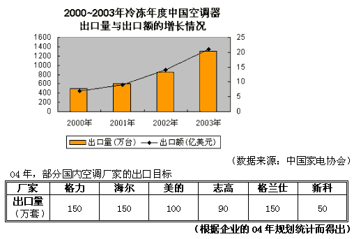 格力、海尔而大巨头提出了150万套的出口目标,这也是他们在完成了03年出口100万套的背景下,信心十足制定出的新目标。而美的丝毫不弱,要完成100万套的出口量,同时争取在3-5年内成为世界最大的空调器生产厂家之一。